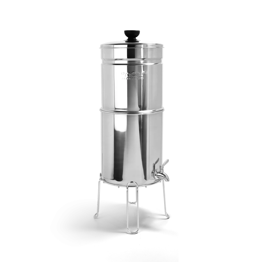 With Bonus Stainless Steel Stand for a limited time only! This High Flow Option includes an extra filter element which allows the system to filter faster. The ProOne Traveler+ system is great for household water filtration but it’s also ideal for travelling or emergency preparedness. Easy to set up. No electricity or plumbing required. Use with just about any potable water source whether at home, office, school, camping or travelling. The system requires no electricity to provide reliable water filtration just about anywhere whether at home, office, vacation or camping! Works with just about any water source including tap, rain tank, bore, lake, river, stream, pond and rainwater. Each system is made from high quality 304 polished stainless steel for lasting durability and attractive appearance. This system is ideal for indoor/outdoor daily use and for emergency preparedness. The ProOne Traveler+ comes equipped with a pair of the new ProOne G2.0 7” filter elements. Tested to remove/reduce: Fluoride (97.5%) Chlorine & other chemicals Giardia & other bacterias Lead, Aluminium, Copper & other heavy metals PFOS, PFAS Microplastics Blue-Green Algae + more ProOne Traveler+ system features include: Recommended for 1-4 persons 8.5 Litres (1.6 gallon) of filtered water storage capacity (17 Litres total) High Flow model supplied # of filters: 2x 7″ ProOne G2.0 Maximum # of filters: 2 Height: 52.1cm (20.5″) Diameter: 21.6cm (8.5”) High quality 304 polished stainless steel Embossed ProOne Logo Includes two ProOne G2.0 7 inch filter Includes Non-slip pad Free upgrade to Stainless Steel Spigot (tap) Free Stainless Steel Stand for a limited time only! The ProOne Traveler+ High Flow comes equipped with 2 ProOne G2.0 7” filter elements: Recommended replacement for 2 ProOne G2.0 7” filter element: 18-24 months Most economical “All-In-One” contaminants & fluoride filter element Silver infused to help prevent growth of bacteria No priming required Easy to clean Leaves in good minerals Nut and Alumina Free Reduces: Removes bad odours and taste Removes chlorine to 99.9%+ Removes chloramines to 99.9%+ Removes detergents and solvents Reduces fluoride up to 97.5%+ Removes viruses to greater than 99.99%+ Removes parasites to greater than 99.999%+ Removes Blue-Green Algaes (Anabaena, Eucapsis, Fischerella, Spirulina etc) up to 99.999%+ Removes Trihalomethanes up to 99.9%+ Removes inorganic minerals up to 99.9%+ Removes heavy metals including chromium, lead, arsenic and aluminium to 99.9%+ Removes cloudiness, silt and sediment. You can filter creek, river and dam water safely Removes hormones & pharmaceuticals up to 99.9%+ Removes petrol & oil up to 99.9%+ Reduces alpha & beta radiologicals, uranium, plutonium etc Removes herbicides and pesticides including Glycophosphates (ie Round-up) up to 100% reduction Removes PFOA & PFOS up to 99.9%+ Specifications Filters: 2x 7 inch ProOne Filter Elements Finish: Polished Filter Lifespan (per pair): Up to approximately 2 years or 2000 Gallons (7570 litres) whichever comes first *depending on individual water quality conditions* Filter Lifespan (per filter): Up to approximately 2 years or 1000 gallons (3785 litres) whichever comes first *depending on individual water quality conditions* Please Note: The Filters once wet must be used within 2 years Click here for ProOne Lab Test Results Please Note: Prior to Travelling we recommend removing all filters from your system and securely storing them to prevent damage. For more information contact the store. (ProOneTrav_HIGHFLOW)