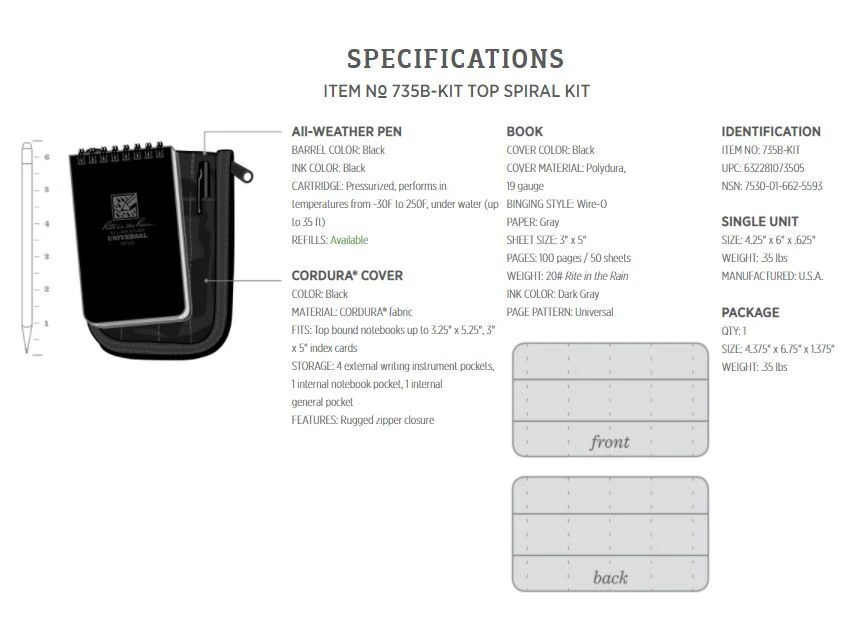 Rite in the Rain All Weather Notebook Kit 3×5″ Tactical Black The global standard for tactical notebooks. This 3″ x 5″ Top Spiral Notebook Kit is discretely sophisticated with its black Polydura Cover and subdued light gray tinted paper. Each book contains 100 pages (50 sheets) of a dark gray Universal page pattern. With the Universal Pattern you can use this text for notes and scaled drawings. Useful reference material (such as metric conversion charts, map scales and rulers) are printed on the back cover. This is designed to be easy on the eyes, delivering the reliability you have come to expect from Rite in the Rain.Rite in the Rain is a patented, environmentally responsible, all-weather writing paper that sheds water and enables you to write anywhere, in any weather. Using a pencil or all-weather pen, Rite in the Rain ensure that your notes survive the rigors of the field, regardless of the conditions. This Kit Contains: 1x No. 735 Back Pocket Notebook 7.6cm x 12.7cm (3″ x 5″). Part of the New Midnight Collection, this 3″ x 5″ top-spiral notebook is discretely sophisticated with its black Polydura Cover and subdued light gray tinted paper. Each book contains 100 pages (50 sheets) of a dark gray Universal page pattern. The Midnight Collection is easy on the eyes, delivering the reliability you have come to expect from Rite in the Rain. 1x No. 97 All-weather Black Clicker Pen – Black Ink While a pencil works great on our All-Weather products, sometimes you just need a pen. These All-Weather pens write on wet paper and upside down in temperatures from -34°C to 121°C. Flat black metal barrel. 1x No. C935B CORDURA® fabric Cover – Black. These Covers fit all 3″ x 5″ top spiral notebooks. They have a rugged zipper closure and hold up to 4 writing utensils! Ideal for: Emergency Services Camping / Hiking Emergency Kits Car & Truck Glovebox (RITR-735B-KIT)