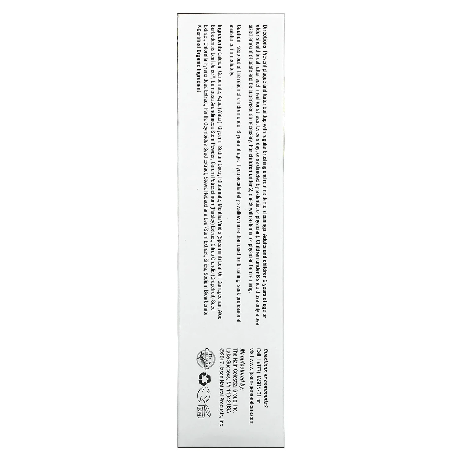 Sea Fresh Strengthening Toothpaste 170g Fluoride Free Fortify your teeth and gums with strengthening Calcium and protein-rich, antioxidant Blue Green Algae. Infused with our gentle blend of stain-fighting whiteners, this botanical paste gives your smile a dazzling sparkle – with a dash of Spearmint and Parsley Extracts for a fully fresh breath. It’s your time to smile and beam with confidence. Jason brand believes in the power of nature’s ingredients to improve everyday wellness. They were pioneers of safer, wholesome personal care, and continue to harness the earth’s bounty of botanicals and essentials for blends that refresh and restore. Wellness is second nature, and it has been since 1959. Features: Fluoride Free, SLS Free & Gluten Free Refreshing Deep Sea Spearmint Flavour No Preservatives, No Artificial Colours, No Artificial Sweeteners, No Saccharin Ingredients: Calcium carbonate, aqua (water), glycerin, sodium cocoyl glutamate, mentha viridis (spearmint) leaf oil, carrageenan, aloe barbadensis leaf juice*, bambusa arundinacea stem powder, carum petroselinum (parsley) extract, citrus grandis (grapefruit) seed extract, chlorella pyrenoidosa extract, perilla ocymoides seed extract, stevia rebaudiana leaf/stem extract, silica, sodium bicarbonate. (2015109)