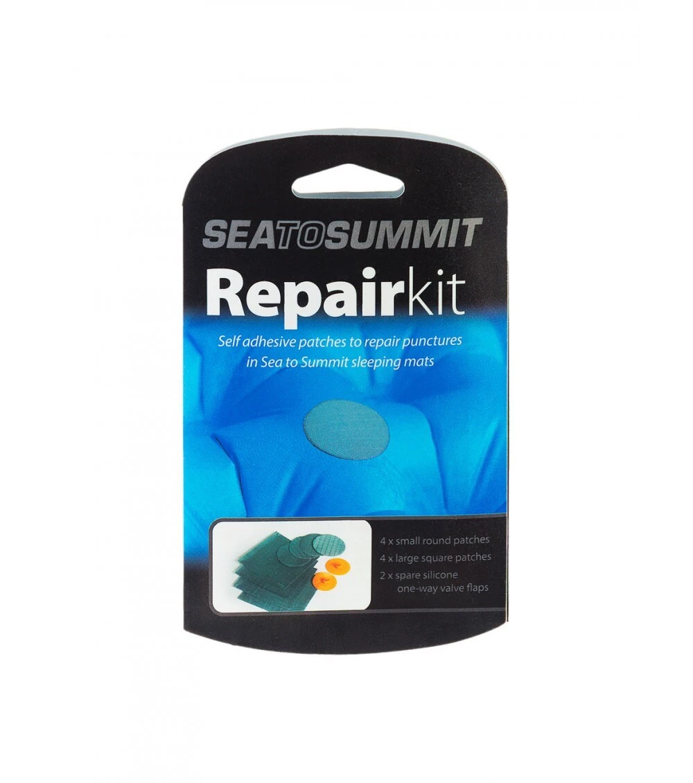 The simple peel-and-stick Sea to Summit sleeping mat Repair Kit with self adhesive patches has been specially formulated for a failsafe bond to Sea to Summit sleeping mat surface fabric. Four 3cm circular grey patches Four 4cm square grey patches Two replacement sillicon one-way valve flaps 1x Instructions Weight of kit: 10g (AMRK)