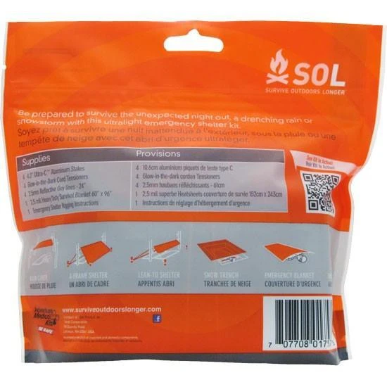 SOL Emergency Shelter Kit Always be prepared to survive an unexpected night out, whether in a drenching rain or snowstorm, with this ultra-light emergency shelter kit you will always be able to stay dry and warm in almost any weather. Designed for use in the Northern Hemisphere and colder climates, the Emergency Shelter Kit would be as useful in Australia to provide shade and protection. Features Heavy Duty Heat Reflective Blanket – 152cm x 243cm, this blanket is 2.5 times thicker than standard Survival Blankets Reflect Heat – Reflects 90% of your body heat back to you to keep you warm Ultra C Stakes – Lightweight anodized aluminum stakes are just what you need to keep the shelter staked down Ideal for Rain Covers, A-Frame Shelters, Lean-to Shelters, Snow Trenches, Emergency Blankets & Shelter Specifications Includes: 1x 2.5 mil Heavy Duty Survival Blanket 152cm x 243cm 4x 10.6cm Ultra-C Aluminium Stakes 4x Glow In the Dark Cord Tensioners 4x 2.5mm Reflective Guy Lines – 243cm 1x Emergency Shelter Rigging Instructions (4140-1757-1)