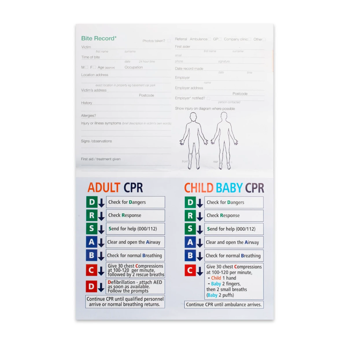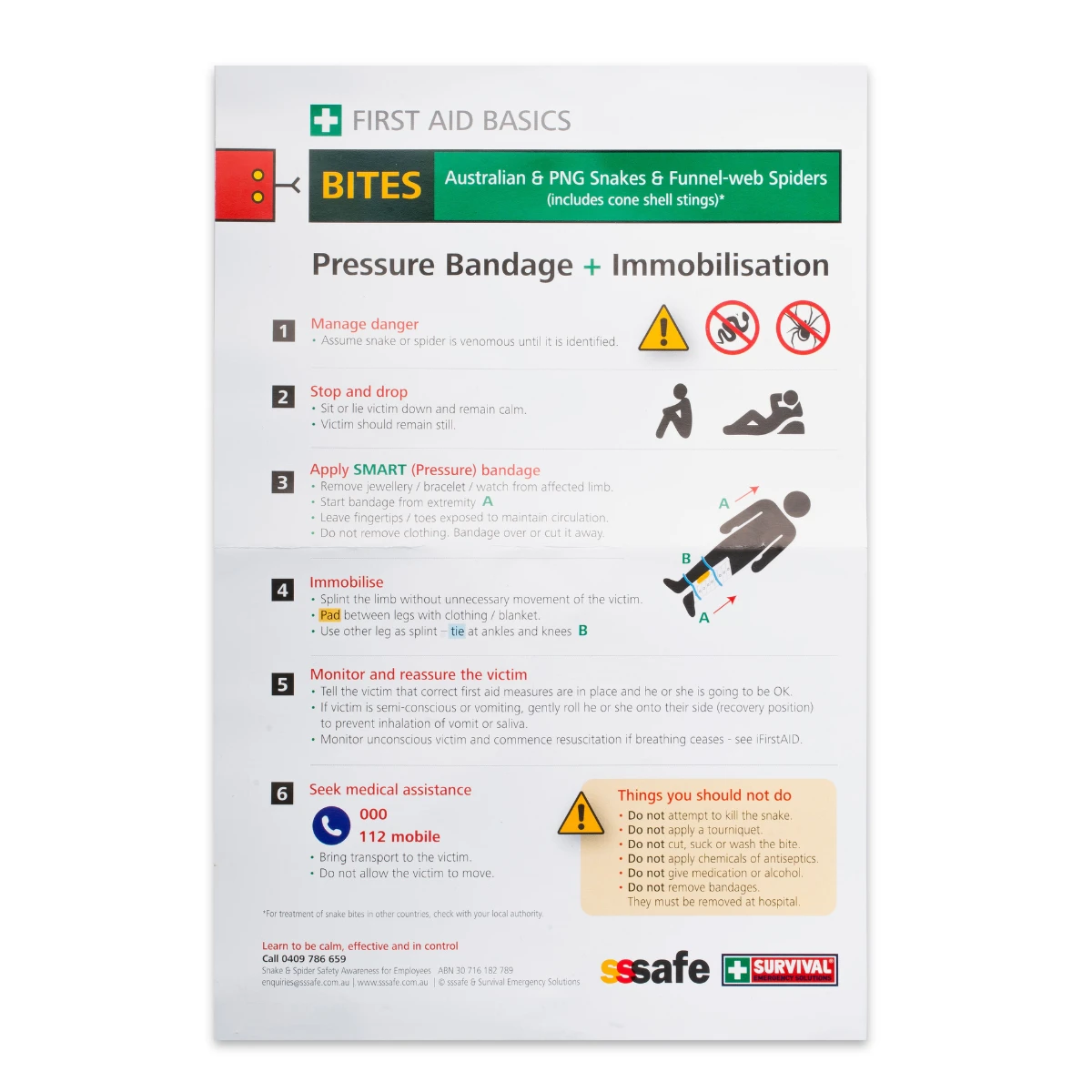 Survival Molle Snake Bite First Aid Kit with Indicator Bandages Complete with all the first aid contents you need to assist in the onsite treatment of a venomous snake or Funnel-web spider bite, this KIT also contains lifesaving instructions on correct snake bite bandage technique Durable and compact, this Snake Bite First Aid KIT has been specifically designed for easy attachment to belts, backpacks, hiking and camping gear, mountain bikes and stores easily in caravans and 4WD’s. The bag itself is coated 600D Oxford polyester, which is durable and water resistant. It’s made with strong zippers and has double stitched handles. The outer KIT can be wiped down with disinfectant liquid. Features: Weighs only 604 grams! Strong Zippers Made from 600D Oxford Polyester – Durable & Water Resistant Double Stitched Handles What’s Inside: 1 x Cotton gauze swabs (3 per pack), sterile, 7.5cm x 7.5cm 1 x Emergency blanket, 2.1m x 1.6m in zip lock bag 1 x Mini black permanent marker 2 x Nitrile gloves, large 3 x SMART Pressure Snake Bite Indicator bandages, heavy duty, reusable and washable 1 x Snakebite instruction card, includes bite record register and CPR instruction card 1 x Plyable Adjustable Field Splint, 11cm (W) x 61cm (L) Specifications: Weight: 604g Dimensions (Closed): 18cm (H) x 9cm (W) x 12cm (L) Dimensions (Opened): 18cm (H) x 9cm (W) x 33cm (L) (SNAKE)
