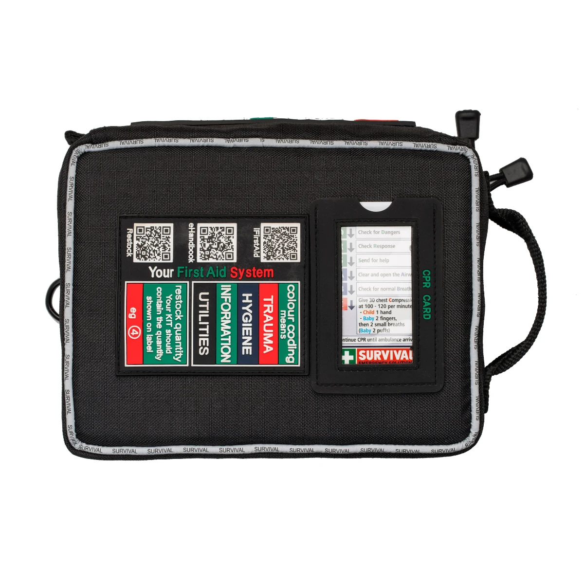 Survival Premium Molle Vehicle First Aid Kit Whether you’re in a car, 4WD, caravan, motorhome, boat or trailer, the SURVIVAL Vehicle First Aid KIT will help prepare you for any emergency on the road. The SURVIVAL Vehicle First Aid KIT has been designed with weight and space in mind, without compromising any of the items on your motorist first aid checklist. Designed in Australia by leading first aid experts, the colour-coded labelling system enables you to clearly identify first aid contents and explains the typical use for each item. This makes it quicker and easier to respond to any emergency situation. An essential addition for every vehicle in Australia. Features: Designed in Australia by leading first aid experts Colour-Coded Labelling System – Quicker Response time Easy Refill & Restock – Numbered labelling system tells you how many of each item you should have Quality First Aid Product Durable & Water Resistant Strong Zippers Luminous Piping on bag is easier to spot at night Includes Instructions Includes Snake & Spider Bite Response Items Personal Space Section – Meshed Pocket to include extra items you may wish to add such as personal medications etc. What’s inside: 50 x Adhesive dressings, sterile individually wrapped 1 x Bandage shears, 19cm stainless steel 2 x Cotton gauze swabs – individual (3 per pack), sterile, 7.5cm x 7.5cm 1 x CPR Card 1 x Emergency blanket, 2.1m x 1.6m in zip lock bag 2 x Eye pads, sterile 1 x Fever scan strip 1 x First Aid Booklet 5 x Hydro gel, sterile 3.5ml sachets 1 x Hypo allergenic adhesive tape, 25mm 2 x Nitrile gloves (1 pair in CPR KIT) 3 x Non-adherent wound dressing, sterile, 5cm x 5cm 1 x Non-adherent wound dressing, sterile, 7.5cm x 10cm 1 x Note pad (located at the back of the First Aid Booklet) & pencil 3 x Plastic bags (3 sizes) 2 x Pressure bandage – 1 SMART Bandage, heavy duty, 10cm x 2m; 1 medium weight, 10cm x 1.8m 1 x Resuscitation shield, disposable, incl 1 pair gloves & skin cleaning wipe (in CPR KIT) 6 x Safety pins 2 x Saline, sterile 30ml 4 x Skin cleaning wipes, with cetrimide (1 in CPR KIT) 1 x Splinter probes, individual, (5 per pack), sterile 1 x Triangular bandage, 96cm x 96cm x 136cm 1 x Tweezers, rust resistant with tip guard, stainless steel 1 x Wound closures (3 per pack), sterile 1 x Wound dressings, No 14 medium, sterile Specifications: Weight: 1051 grams Dimensions (Closed): 21cm (H) x 11cm (W) x 19cm (L) Dimensions (Opened): 21cm (H) x 11cm (W) x 68cm (L) (Vehicle)