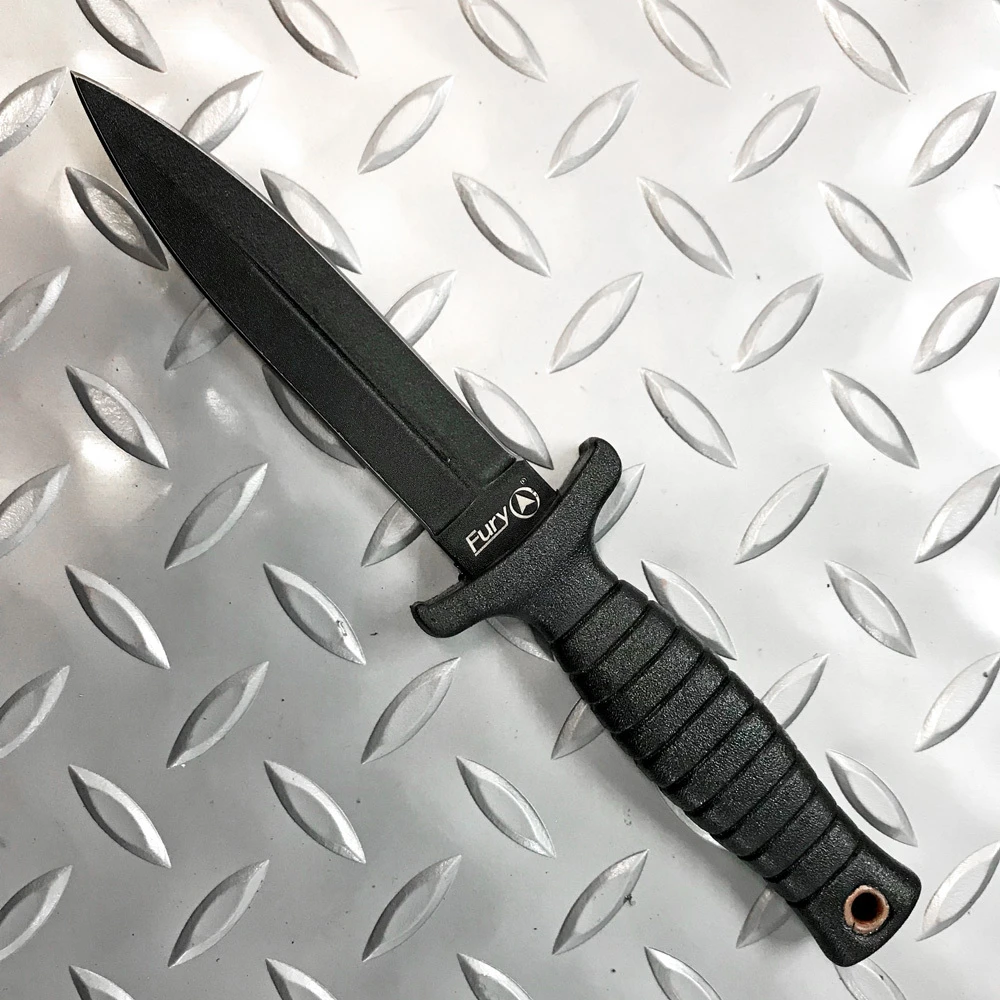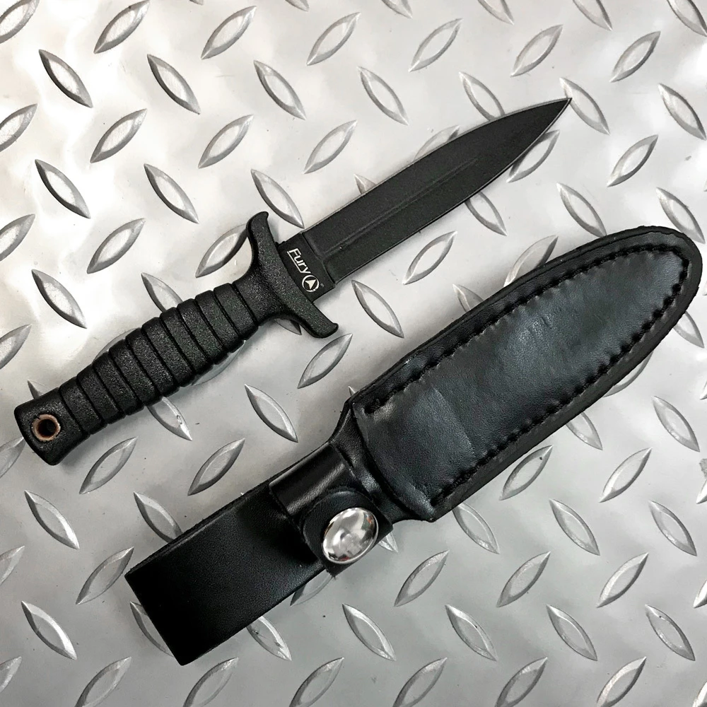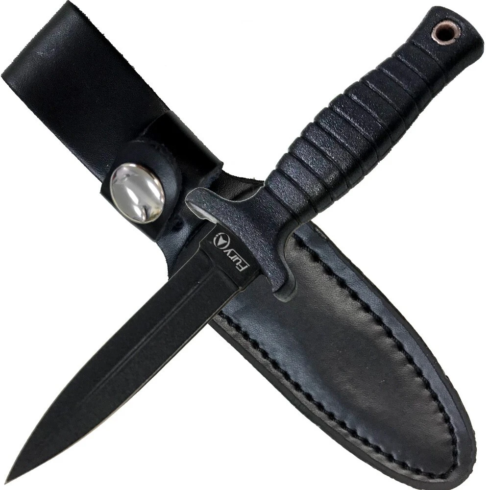 The Small Tactical Boot Knife features a Full Tang spear point blade and a rubberized handle for high grip. Designed for professional tactical use. Features: Full Tang 440C Stainless Steel Blade Double Edged, Spear Point, Non-Reflective Black Blade Black Rubberized Handle with Lanyard Hole Includes Black Leather Sheath with Belt Loop, Modular Clip and Secure Knife Clip Specifications: Blade Length: 93mm Total Length: 177mm Blade Thickness: 3.2mm Material: Full Tang 440C Stainless Steel Blade Weight: 105g (incl sheath) Please note: You must be 18+ to purchase this product. This item may be prohibited in some states, such as VIC and SA. We suggest checking with your local State Regulations before purchasing this product. (75541)