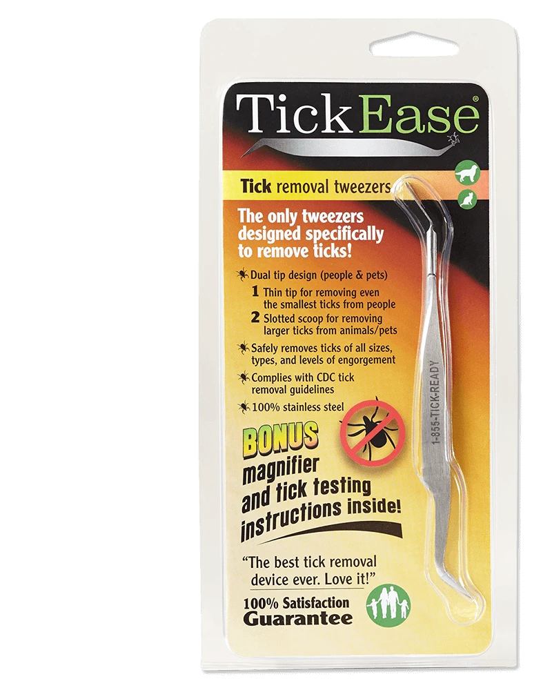 Tick Ease Tick Removal Tweezers TickEase tweezers, with their fine-tipped, pointy design, were made specifically for the effective removal of engorged ticks! The Center for Disease Control (CDC) and the Tick Encounter Research Center (TERC) at the University of Rhode Island both recommend the use of “fine-tipped” or “pointy” tweezers for the proper and effective removal of ticks for humans. The truth is that traditional household tweezers are designed for the removal of slivers. They are no more appropriate for removing ticks from your skin than are fine-tipped TickEase tweezers for removing slivers. In fact, using household tweezers to remove an engorged tick increases the chances of tearing the tick, which just exacerbates the problem. And they are certainly not effective for removing tiny nymph-stage ticks. Prompt and complete removal of engorged ticks is vital to avoiding tick-borne diseases. Only TickEase tweezers were designed for the job! TickEase features: Designed specifically to comply with the CDC’s tick removal guidelines The only dual-tipped tick remover available Safely removes ticks of all sizes, types and levels of engorgement For people and pets Made from durable stainless steel Can withstand the heat of an autoclave for sterilization Simple design is easy to use Effective and affordable Includes Tick Magnifier Designed in USA Specifications: Stainless Steel Dimensions: 14.2cm x 2.2cm Weight: 15 grams (TICKEASE01)