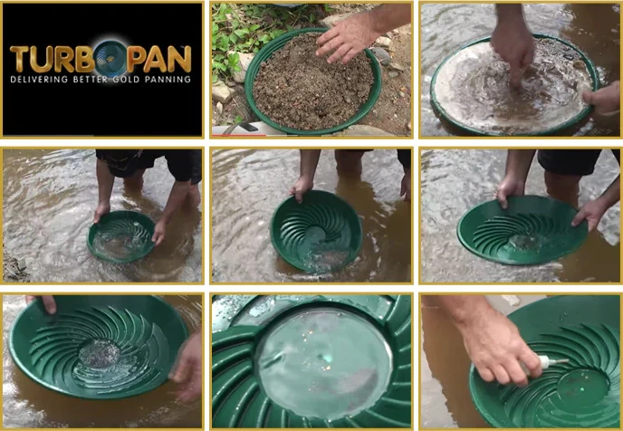 TurboPan Gold Pan 40cm Green Turbopan is just like a sluice – in a pan. The sluice riffles don’t just trap the gold in protected zones, they funnel the gold into the central deep pocket. With the riffled bottom, it’s good bye to compaction plus, because Turbopan is wide and shallow, the very heavy gold sinks quickly to the bottom to be trapped. Just use Turbopan like you would normally pan and discover how much more gold you keep. Check the fines with a 10x hand lens to see the 10 micron gold Turbopan catches. Features: Green – Strong Contrast for Gold, cassiterite, azurite and black sands. It’s easier to pan away the black sands when you can see them. Designed & Manufactured in Australia Concentrates Gold in the deep Pocket in the Center of the Pan Sluice in a Pan – riffles funnel gold to the Center of the Pan then become trapped Simple & Easy to Use Specifications: Dimensions: 40cm (Dia.) x 5.5cm Colour: Green Weight: 350g (8930614GRN)