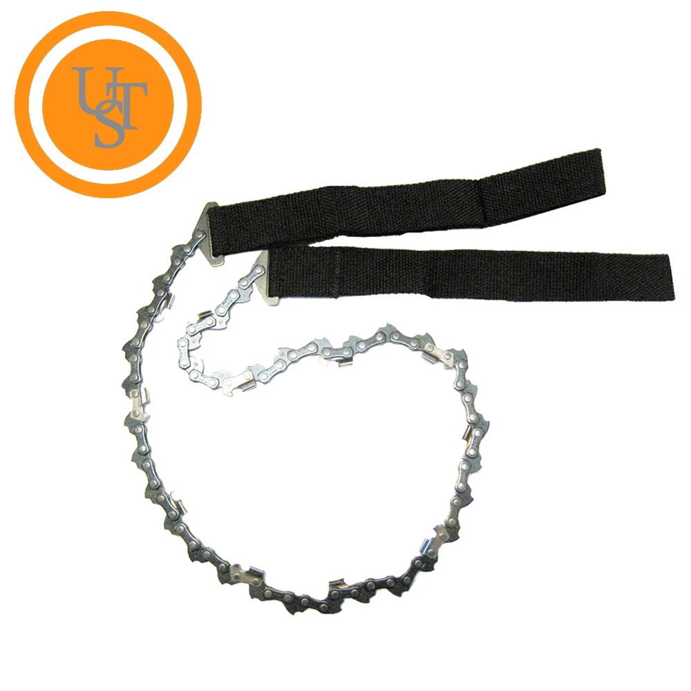 UST Sabercut Chainsaw The UST Sabercut Chainsaw is a heavy-duty chainsaw with a bi-directional 609mm blade made to easily saw through tree limbs and branches and cut at a variety of angles with little clearance. It is the perfect tool for backcountry travel, ultralight backpacking and emergency preparedness, plus is lightweight and pocketable for easy carry and storage. Features: Flexible, Pocketable 609mm Approx. blade Bi-directional non-binding chain Self-cleaning Saw Teeth Lasts indefinitely with minimal maintenance Comfortable wrist straps for less stress on your hands Can cut at a variety of angles with little clearance Great for cutting limbs and branches at ground level Sharpens with standard 1/8 inch saw blade sharpener Can be extended by simply adding extra cordage to each handle (rope not included) (20-1WG0185)