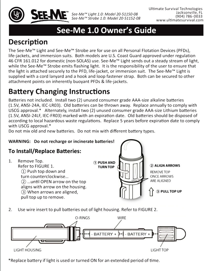 UST See-Me 1.0 LED Waterproof Light The UST See-Me 1.0 LED Light Orange is an ideal personal locator light, visible for up to 5.5 km on a dark clear night, that ensures you can be quickly located in an emergency whether your on the trail or on the water. IPX7 Waterproof rating, this see-me light is great for backpacking, camping, hunting, boating, having floatation devices (PFDs), and more. Features: Compact Waterproof – Submersible up to 1 meter Lifetime LED Bulb never needs to be replaced Lasts 17 continuous hours Lanyard cord and hook-and-loop strap included Specifications: Lumens: 20Lm of 360-degree Light Battery Type: 2 x AAA Alkaline Batteries (Not Included) Run Time: 17 Hours Water-Resistant: IPX7 – Works submerged at 1 meter for 30 minutes Visible up to 5.5km on a dark clear night Lifetime bulb never needs replacing Easy Twist On/Off Control Includes Lanyard and Hook-and-Loop Strap Dimensions: 126mm x 25mm Weight: 51g (SeeMELight1.0_P)