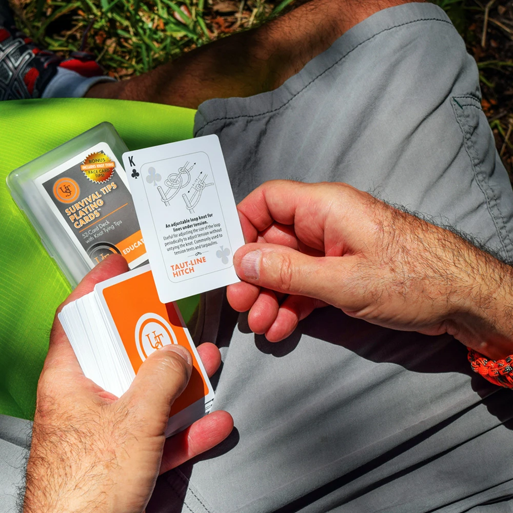 UST Survival Tips Playing Cards w/ Knot Tips Learn survival skills and enjoy playing card games at the same time with these durable and water-resistant UST Survival Tips Playing Cards with Knot Tips. Each numbered card features a different survival tip or fact, and each face card features illustrations and descriptions of how to tie a variety of knots. Can withstand wear-and-tear for long term use and comes with a convenient plastic case to keep your cards dry in wet conditions. Features: Deck of Playing Cards with Wilderness Survival and Knot Tying Tips Entertaining and Educational Waterproof and Durable Numbered Cards Feature Survival Tips; Navigation, Fire-Starting, Shelter Building, etc. Face Cards Feature Illustrations and Descriptions on Tying a Variety of Knots Includes 2 Joker Cards and 2 In Case of Emergency Cards Includes Plastic Case for Protection and Easy Storage Specifications: Dimensions: 90 mm x 63 mm x 13 mm Weight: 120g (20-02700-08)