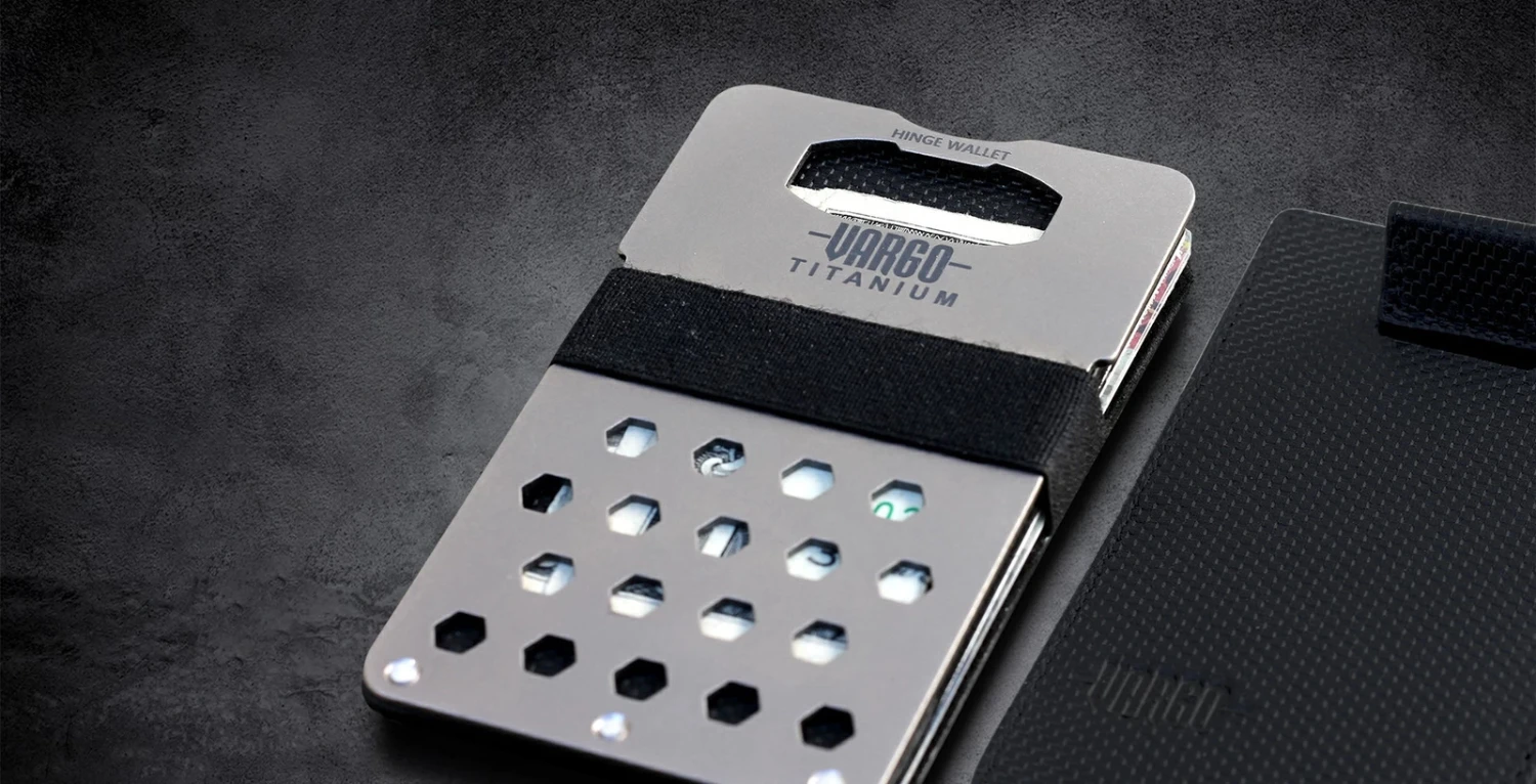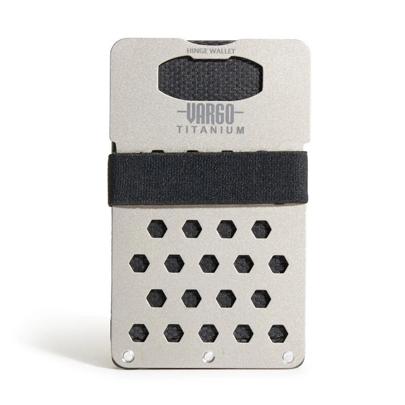 The Vargo Minimalist Titanium Hinge Wallet makes accessing your cards and cash easy and fast. Unlike traditional minimalist wallets that only have one pocket, the Hinge Wallet has two which means you can easily locate the card or bill you’re looking for. The integrated titanium plate protects your cards from any bending or damage they would normally take in an all-leather wallet. The built-in bottle opener means that you’ll never be scrambling around trying to find one- you’ll always have one with you. The minimalist design, durable & lightweight titanium construction, and elegant genuine leather combine to make the ultimate minimalist wallet. Features: Dual pocket hinge system 10 card pocket Cash pocket Pull tab for easy access to cards Bottle opener Specifications: Weight: 53.86 grams Height: 95 mm Width: 56mm (T-489)