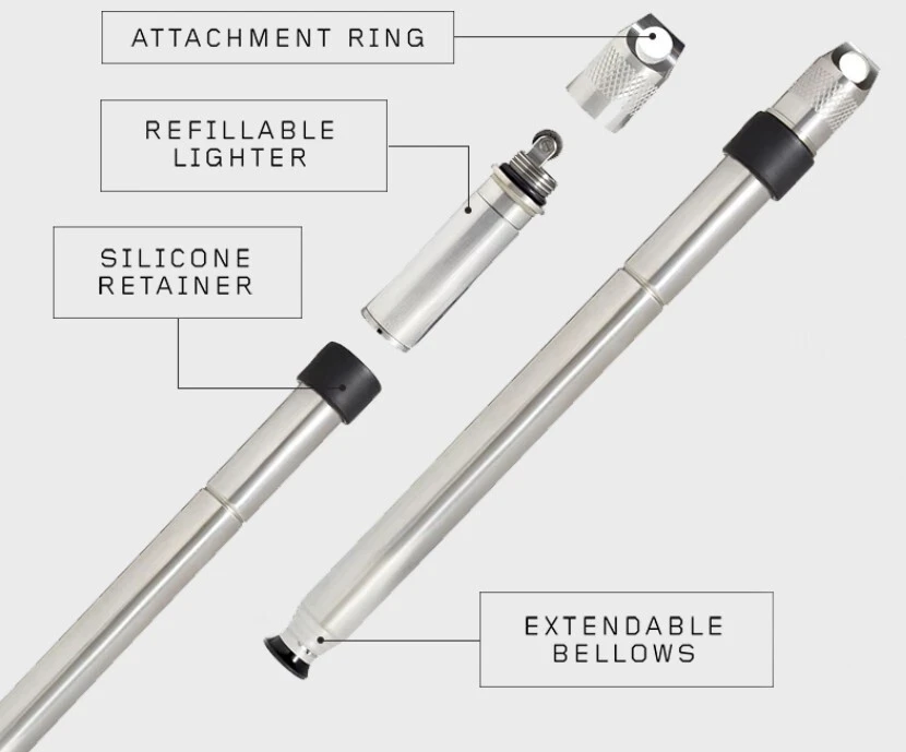 Vargo Ultimate Fire Starter BLAZE The Ultimate Fire Starter – The Vargo Blaze has everything you need to start a raging campfire anywhere you go. The refillable lighter will help ignite any tinder and the extendable bellows will allow you to effectively blow your flame into life. No more sticking your face down into the extreme heat of the coals. Keep a comfortable distance away and target the specific location you want to blow on. Starting and maintaining a fire has never been so fast and effortless. Features: Refillable lighter Extendable bellows Attachment ring for convenient carry Sturdy construction for rugged use Specifications: Weight: (76 grams) 2.7 ounces Length collapsed: (49.5 cm) 19.5 inches Length extended: (18.4 cm) 7.2 inches *NOTE- Fuel not included. Only use with standard lighter fluid (light petroleum distillate.) (T-483)