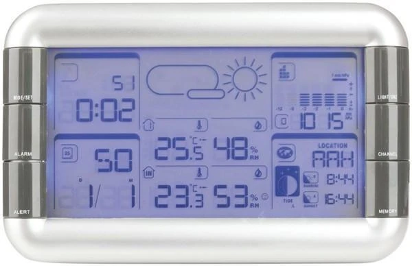 This stylish unit features moon phases for the Australian/NZ region. It has an external temperature/humidity, barometric sensor and fantastic time logging: Features: • Clock, clock alarm/snooze • Calendar, including Day announcement • Barometer trend log • Weather forecast icons: Sunny, Partly Cloudy, Cloudy, Rainy, etc • Moon phase display (with tide indication) • Sunrise/sunset time display • Temperature/humidity display • Temperature alert alarm • All-in-all excellent value for money • Transmitter frequency 433MHz • Power 2 x AA & 2 x AAA (not included) • Dimensions Console: 220(W) x 141(H) x 36(D)mm • Transmitter: 100(W) x 55(H) x 22(D)mm (XC0366)