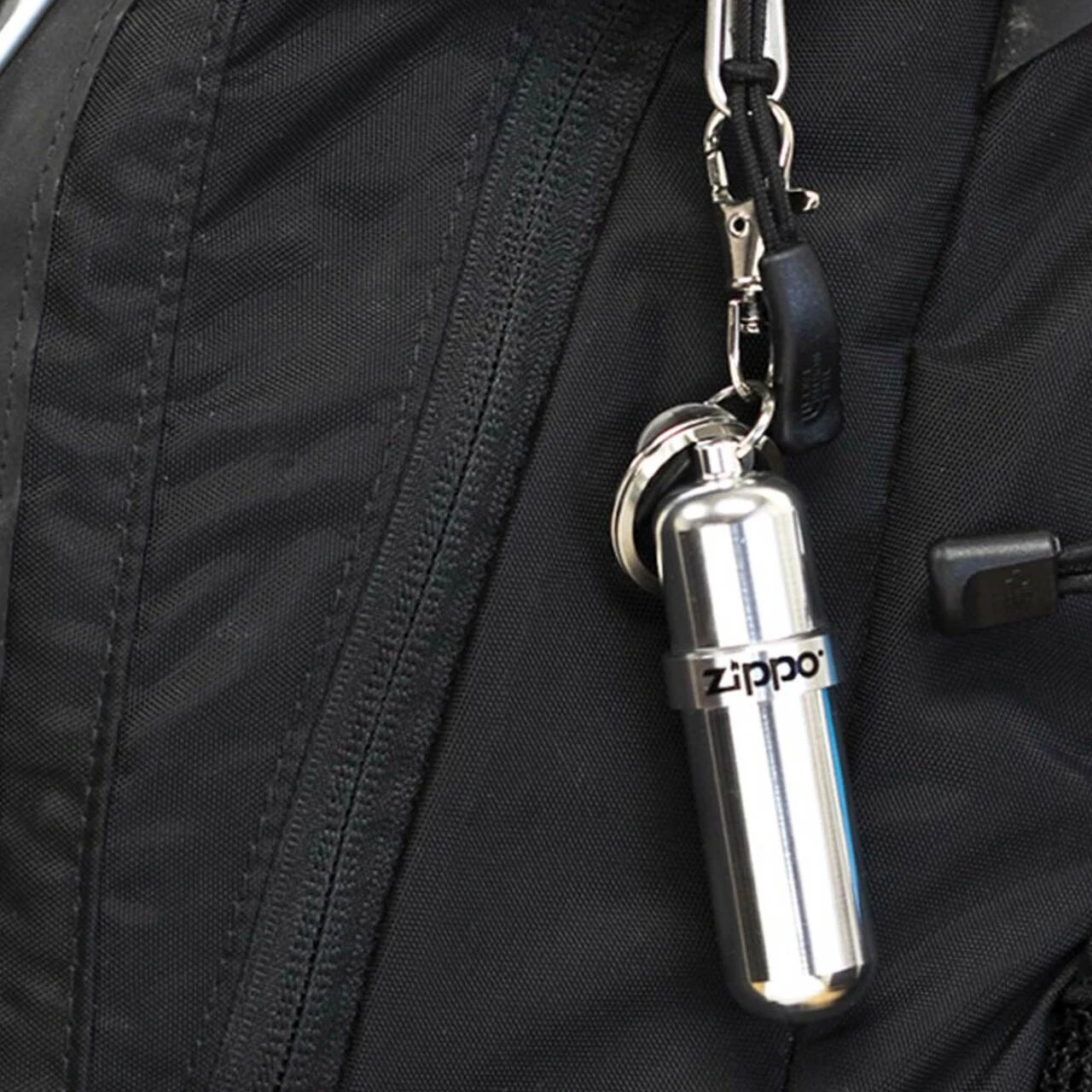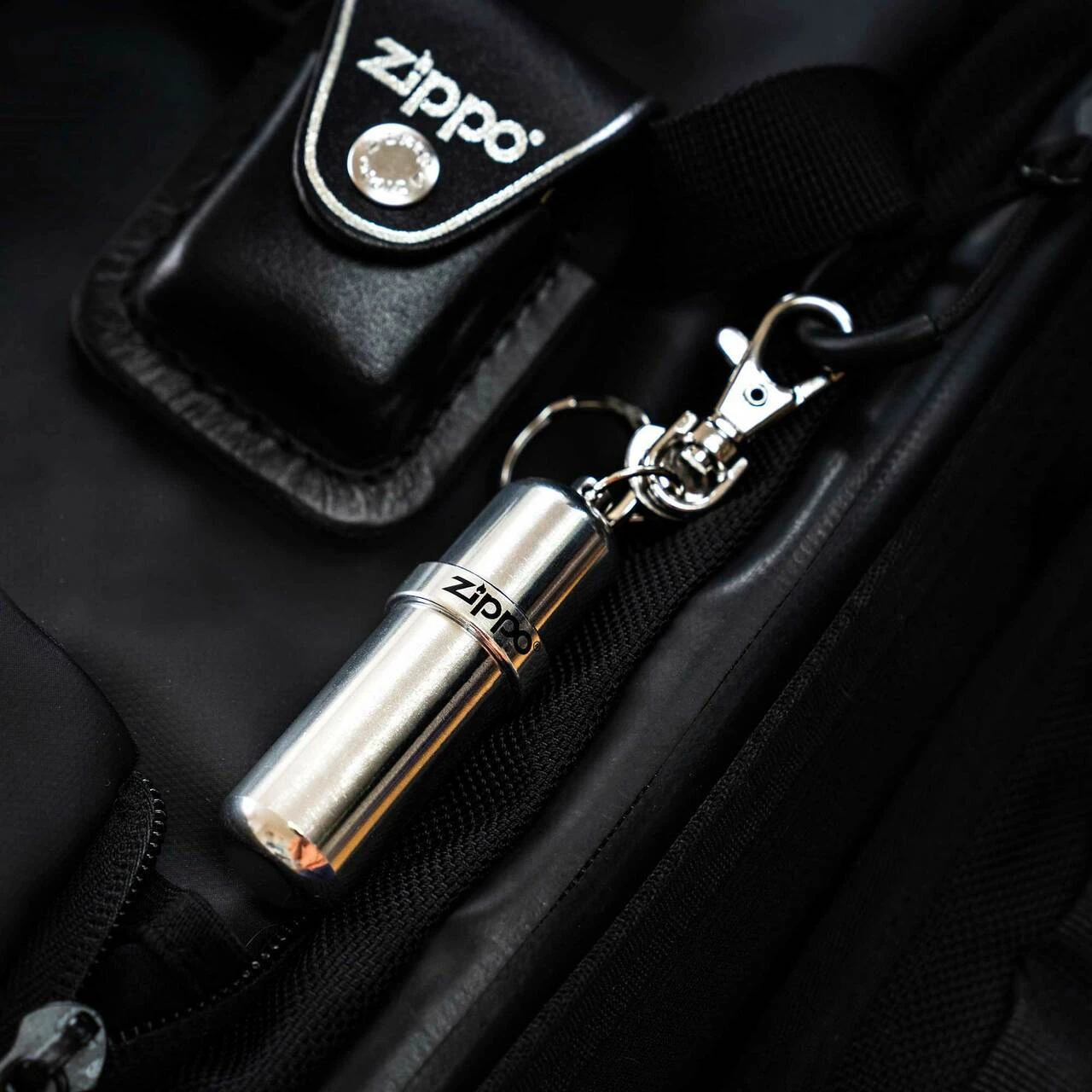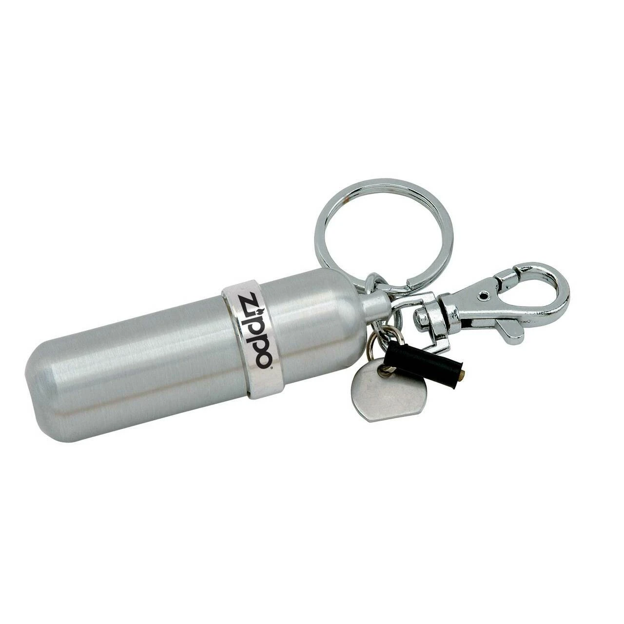 Zippo Aluminum Fuel Canister Take along an extra refill of Zippo premium lighter fluid. A reusable personal-sized aluminum canister holds enough fuel to fill one Zippo windproof lighter or a 6-hour fill on a Hand Warmer. Includes swivel snap fastener, split ring for keys, disk to tighten and loosen flint screw, and rubber storage sleeve for two extra Zippo flints. Features High-quality aluminum Swivel clip & split key ring – Holds keys or clips to anything Protects fuel from evaporating & lasts longer Quickly loosens/tightens lighter flint screws Flint screw tool – Stores one Zippo flint Specifications Height:11.5824cm Width:2.3876cm Depth:2.3876 Weight:35.4882ml Please Note: Butane Fuel Sold Seperately (110291)